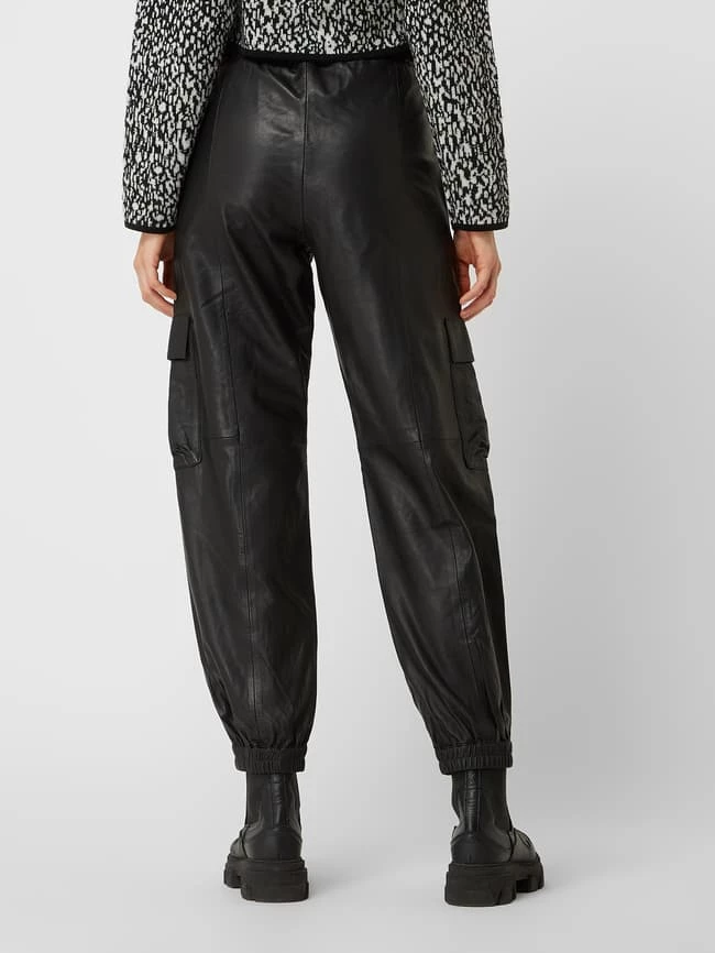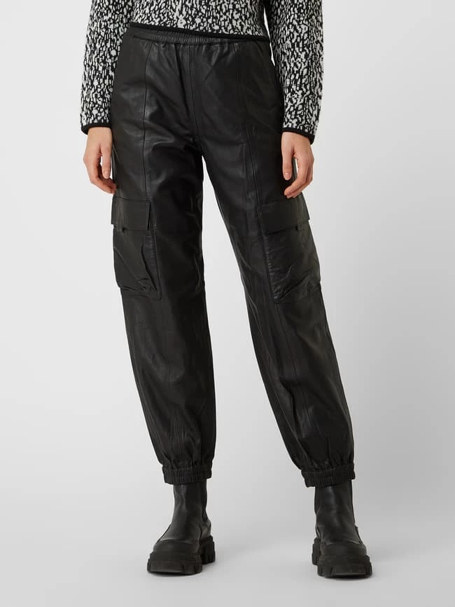 Die Schlupfhose von GESTUZ ist aus Leder gefertigt. Sie zeigt sich in lockerer Passform mit elastischem Bund, französischen Eingrifftaschen und Cargotaschen. Der Vorteil von Schlupfhosen: Sie kaschieren breite Hüften und kräftige Oberschenkel.